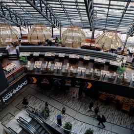 На четвертом этаже находится гастрономический фудмолл «Конкорс », объединяющий десятки заведений с разными кухнями, бар, бильярдный зал, а также маркеты, арена виртуальной реальности и другие развлекательные зоны.