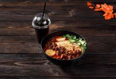 1100 г / 400 мл • Рамен с тушеной говядиной (говяжья грудинка, перец, лавровый лист, корица, дайкон, лапша), Китайский лимонад «Кислая слива»
