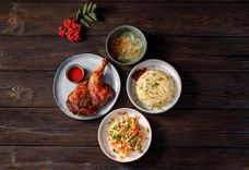 1300 г • Thai mix salad (огурец, помидор, ананас, манго, морковь, красный лук, кинза, Тай дипинг соус), Жареный рис с соусом Том Ям, Половина красной курицы в маринаде из тайского соуса, Бульон с говядиной и овощами