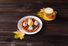 200/50 г / 270 мл • Бельгийская вафля классическая/либо с кусочками пряного шоколада, Шарик джелато (на выбор), Американо/капучино/чай (на выбор)