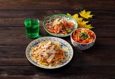 400/150/300 г / 200 мл • Лагман сай (восточная лапша, говядина, овощи), Салат Шакароб (огурцы, помидоры, красный лук), Плов с курицей, Тархун