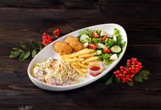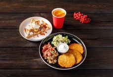 290/260 г / 350 мл • Драники с беконом и грибами (микс салата, лук, фирменная заправка, драники, бекон, грибы, сметана), Блинчик Пражский (блин, яблоко, корица, сладкий сливочный сыр, карамель, грецкий орех, ванильное мороженое), Теплый морс (апельсин-облепиха)