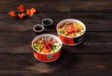 680 г • Поке с тунцом (тунец, соус айоли, авокадо, огурец, морковь, лук фри, имбирь, тобико, нори, кунжут, соус поке), Поке с курицей (курица в соусе терияки, рис, соус айоли, кукуруза, огурец, начос, черри, лук фри, соус терияки, кунжут, авокадо)