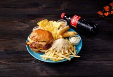 700 г / 500 мл • Бургер «Лава де Кесо», Сырные палочки, Начос, Картофель фри, Фирменный соус «Кон ахо», Кола/фанта/спрайт/бонаква (на выбор)