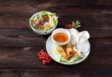 510 г • Бун бо Чон (рисовая лапша с жареной говядиной с овощами в кисло-сладком соусе), Нэм (жареные блины со свининой, яйцом, грибами, стеклянной лапшой и овощами)