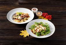 670 г • Салат Промо (листья салата, куриное филе, киноа, запечённые овощи, рукола, соус дижон), Паста Карбонара (паста, бекон, грибной микс, твёрдый выдержанный сыр, сливочно-грибной соус)