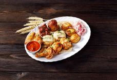 720 г • Свиная шея, Куриные крылья, Картофель на мангале, Куриное филе, Фирменный соус, Лук маринованный