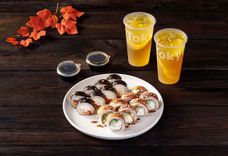 500 мл • Урамаки бекон (рис, нори, бекон, огурец, творожный сыр, унаги соус, кунжут) (8 шт), Маки лосось (рис, нори, лосось, такуан, творожный сыр, сладкий чили) (8 шт), 2 соевых соуса Чай «Жасмин-лимон», Улун с лимоном