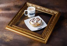 Классический чизкейк холодного приготовления, Капучино • Вдохновлено картиной «Над городом» Марка Шагала • Чизкейк и капучино в гармонии вкуса — как тихий полёт над городскими крышами, наполненный светом и лёгкостью.