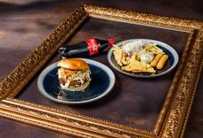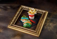350/120 г • Синий бургер с сочной куриной котлетой, хрустящим беконом, глазурью «Теннеси» и чесночным тартаром или красный бургер с сочной говяжьей котлетой, перченым соусом, картофелем пай и пикули (на выбор), Картофель-фри с соусом «Ранч» и луком криспи • Вдохновлено картиной «Банки с супом Кэмпбелл» Энди Уорхолла • Ярко, смело, вкусно – как миниатюрные поп-арт картины на вашей тарелке.