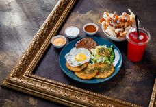 400/50/50/80/40 г / 400 мл • Три золотистых драника с хрустящей корочкой, сочная говяжья котлета с жареным яйцом, микс-салат под цитрусовой заправкой с криспи-луком, Сметана, Пикантный «гриль-соус», Сладкий хворост, Карамельный топинг, Освежающий лимонад «Арбуз-базилик» • Вдохновлено картиной «Богатыри» Виктора Васнецова • Сытная глубина вкусов сочетается с лёгкой свежестью и мягкой сладостью — как сила и спокойствие, застывшие в образах «Богатырей» Виктора Васнецова