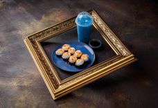 250 г / 50/500 мл • Ролл с тунцом, такуаном и сырной шапочкой с соусом «сладкий чили», Соевый соус , Напиток на основе чая «Персик-кокос» • Вдохновлено гравюрой «Большая волна в Канагаве» Кацусика Хокусай • Свежесть тунца, нежная сладость соуса и прохлада напитка — как шум и ритм великой волны Хокусая, когда мощь океана встречается с утренним спокойствием побережья.