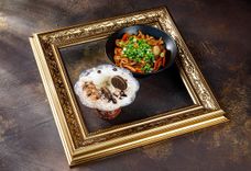 400/250 г • Вок с лапшой, куриным филе и овощами, Бинсу: ледяной снежок из коровьего и кокосового молока с добавлением различных топпингов (сгущённое молоко, шоколадный соус, кокосовые чипсы, какао, печенье «Орео») • Вдохновлено гравюрой «Красная Фудзи» Кацусика Хокусай • Контраст холодного десерта и горячего вокa — словно красная Фудзияма поздним летом, освещённая восходящим солнцем.